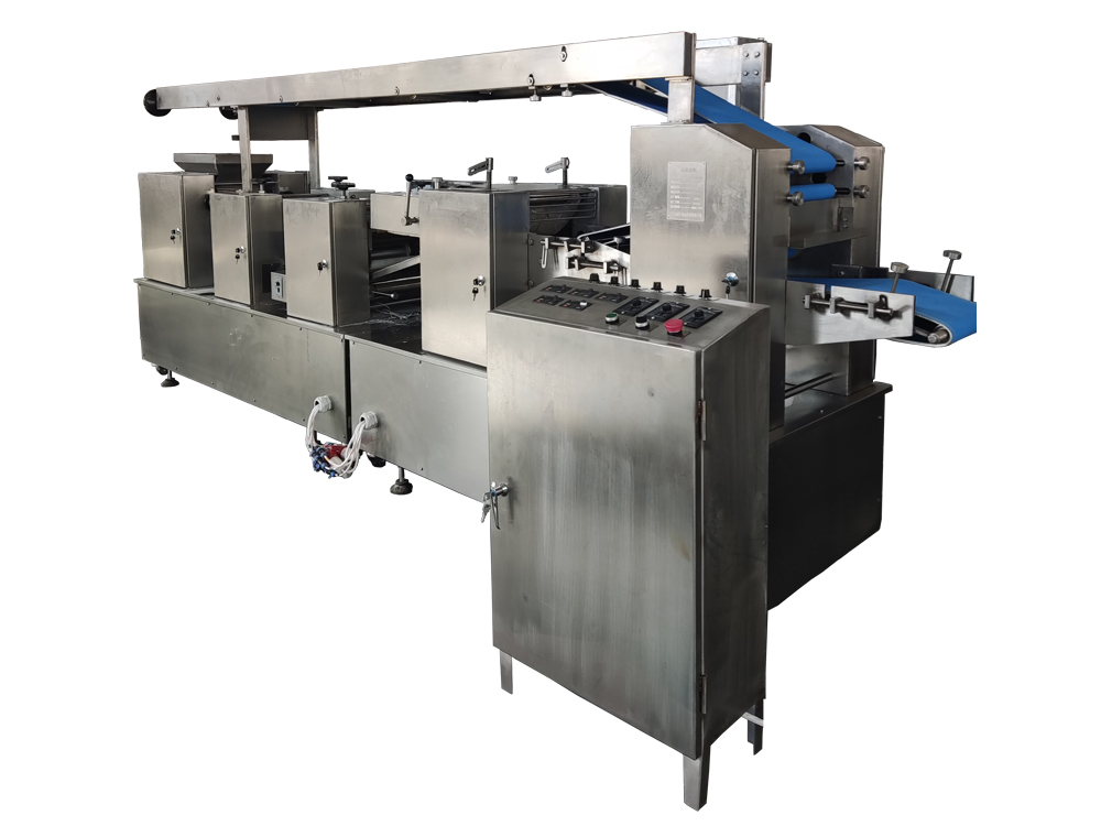 制皮機為臥式成型機,通過(guò)傳送機構將各道軋輥線(xiàn)速度比合理分配,實(shí)現從投料到制皮成型自動(dòng)化生產(chǎn)。適用于餃子皮、餛飩皮、燒麥皮、蒸餃皮、以及燙面類(lèi)面皮成型。